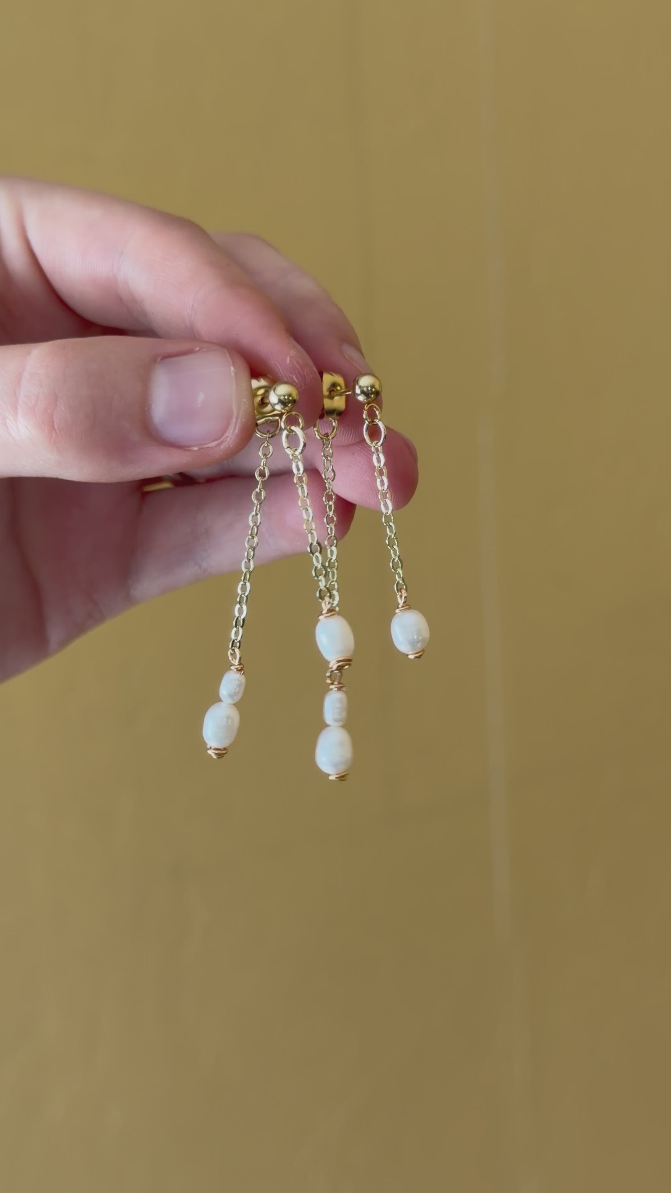The Layla Double Sided earrings feature two sizes of pearls that dangle behind and in front of the stud earrings, creating a double sided earring effect.
